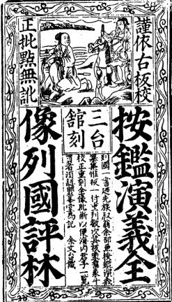 即使书坊主实际上是为了追求经济利益,也冠冕堂皇地将经济利益和伦理教化联系在一起。书坊主用插图、合刊等手段来促销自己刻本的同时,几乎每个书坊主都自己出面或请人作序说明自己的刻本对伦理教化的意义。余象斗于万历二十年弃儒从商,刊行《新刻按鉴全像批评三国志传》,“全像”与“批评”兼具,正文页面分三栏:上评、中图、下文,显然是为了小说的传播。万历二十二年,又刊刻《全像忠义水浒志传评林》,正文前有《题水浒传叙》,高度评价《水浒》的“忠义”主旨:“有为国之忠,有济民之义”,并在《叙》之眉栏写有《水浒辨》,概括此书特色:“《水浒》一书,坊间梓者纷纷,偏像者十余副,全像者只一家……今双峰堂余子,改正增评,有不便览者芟之,有漏者删之,内有失韵诗词,欲削去恐观者言其省漏,皆记上层,前后廿余卷,一画一句,并无差错。士子买者,可认双峰堂为记。”这显然是在为自己的刊本做推销。推销而不忘小说的“忠义”主旨,让人有理由相信标举“忠义”也是推销的一个手段。万历三十四年,又刊刻《按鉴演义全像列国志传评林》,正文前有《题全像列国志传引》,称该书有“善则知劝,恶则知戒”之功用,封面有余文台“识语”:“《列国》一书,乃先族叔翁余邵鱼按鉴演义纂集,惟板一付,重刊数次,其板蒙旧。象斗校正重刻,全像批断,以便海内君子一览,买者须认双峰堂为记。”卷一首页之眉栏写有“列传数句,将列国一本包尽”,同样将戒恶劝善和刊本推销联系在一起。刊刻时采用“上评、中图、下文”的版式,将评语置于版式的最上端,引起读者注意,其次是能增添读者乐趣的插图,然后才是小说正文,其用意在于以评补文、以图补评,将评语与插图结合起来,从而更好地理解小说正文。以此观之,在余象斗那里,插图也可以理解为一种“评”的方式,插图和评语共同组成“评林”。