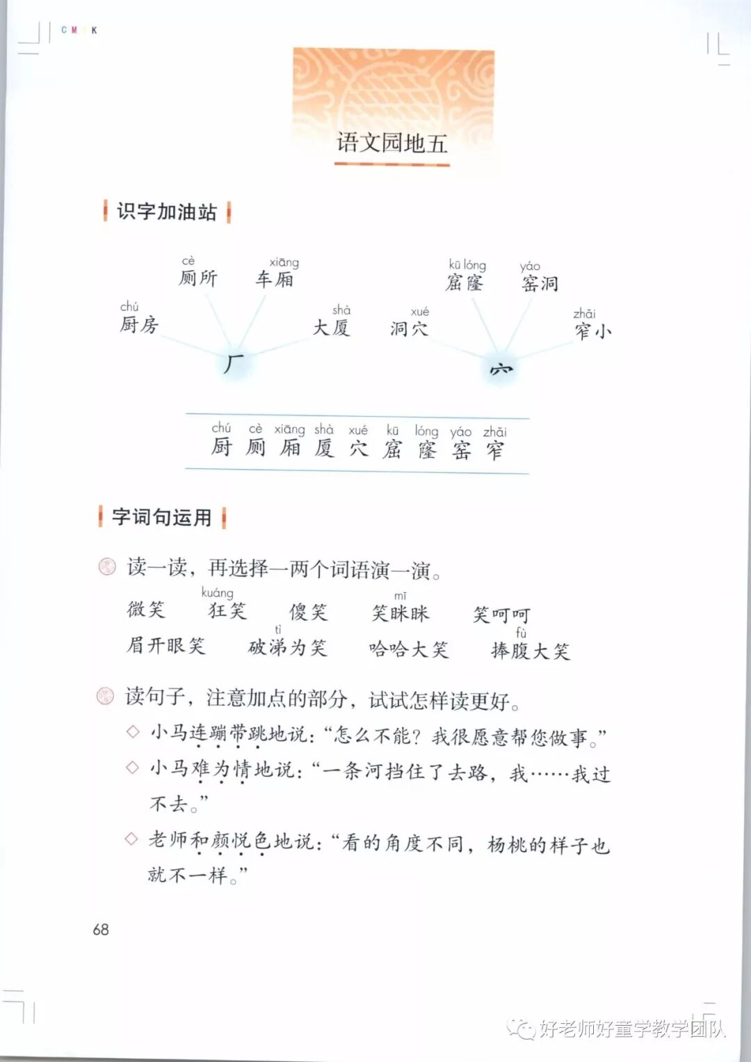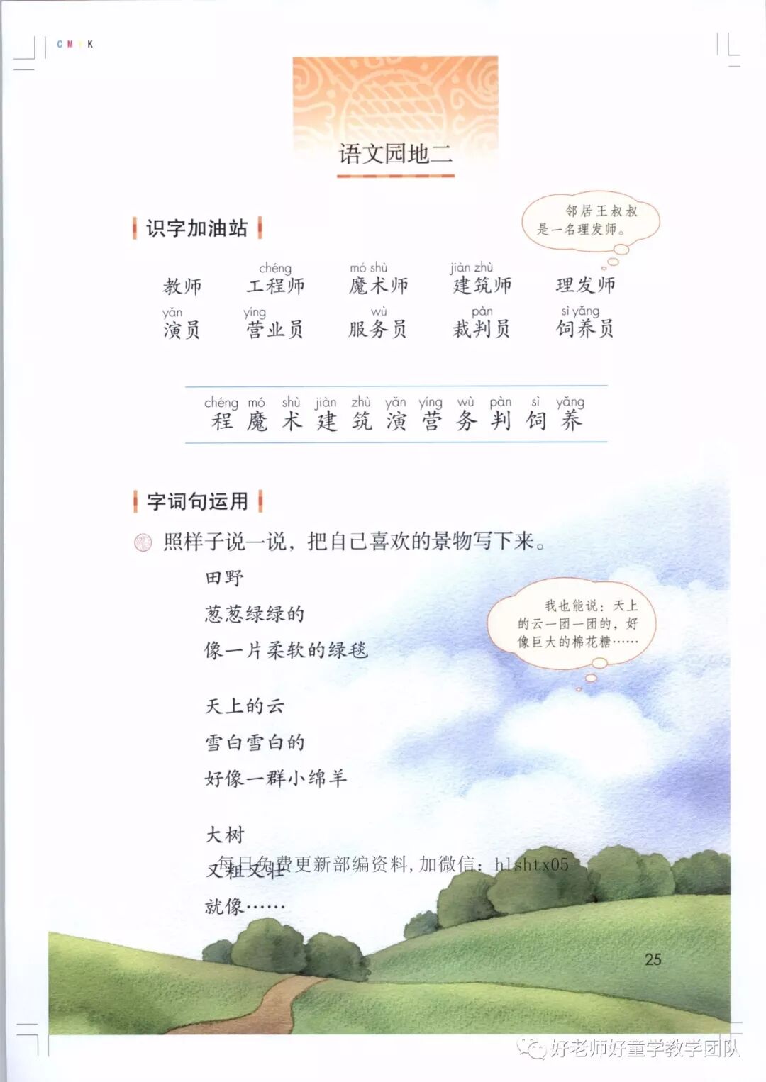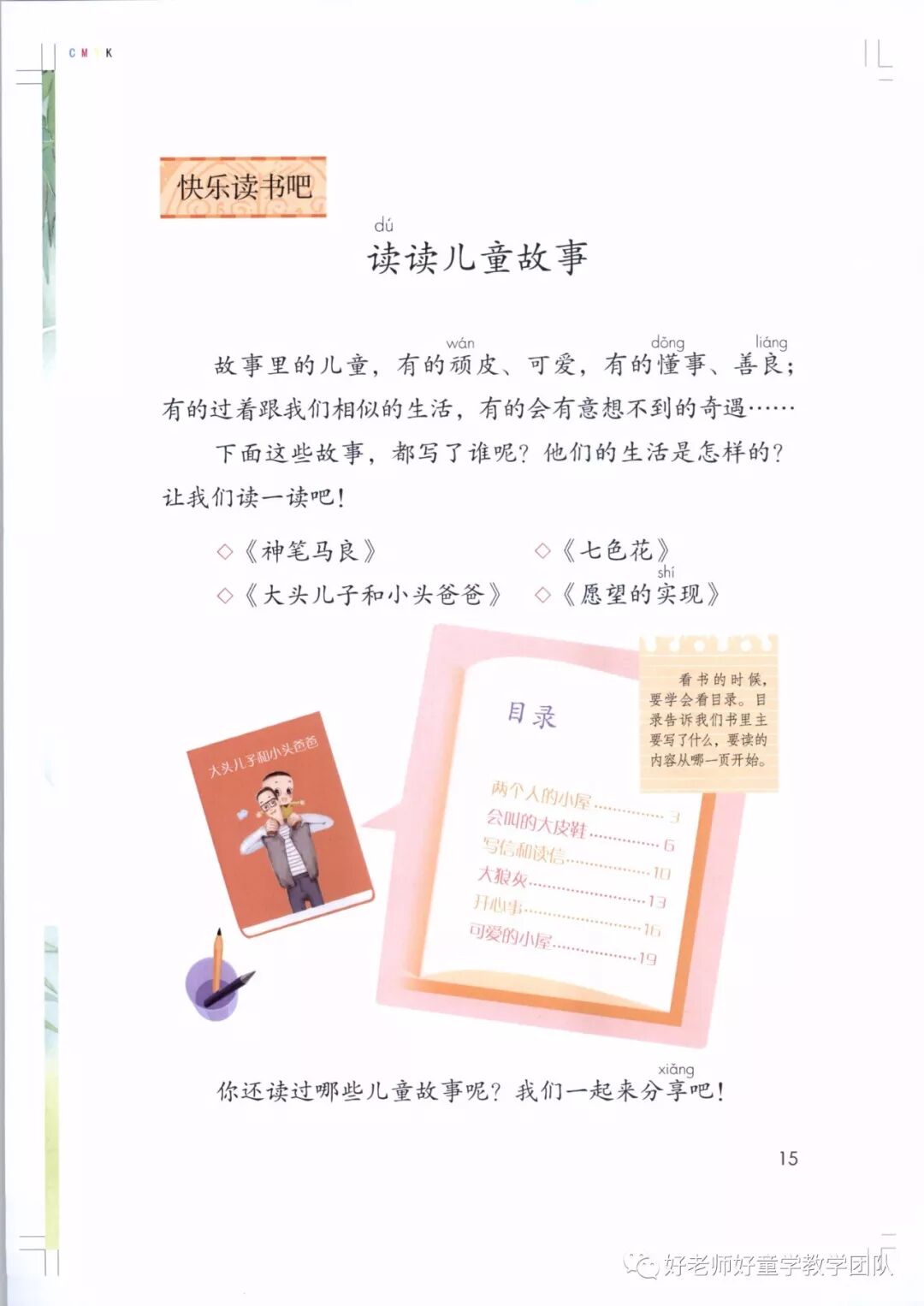 每组课文包括导语、4篇课文和一个“语文园地”。“语文园地”包括五个栏目:识字加油站、字词句运用、写话、展示台、我爱阅读。
