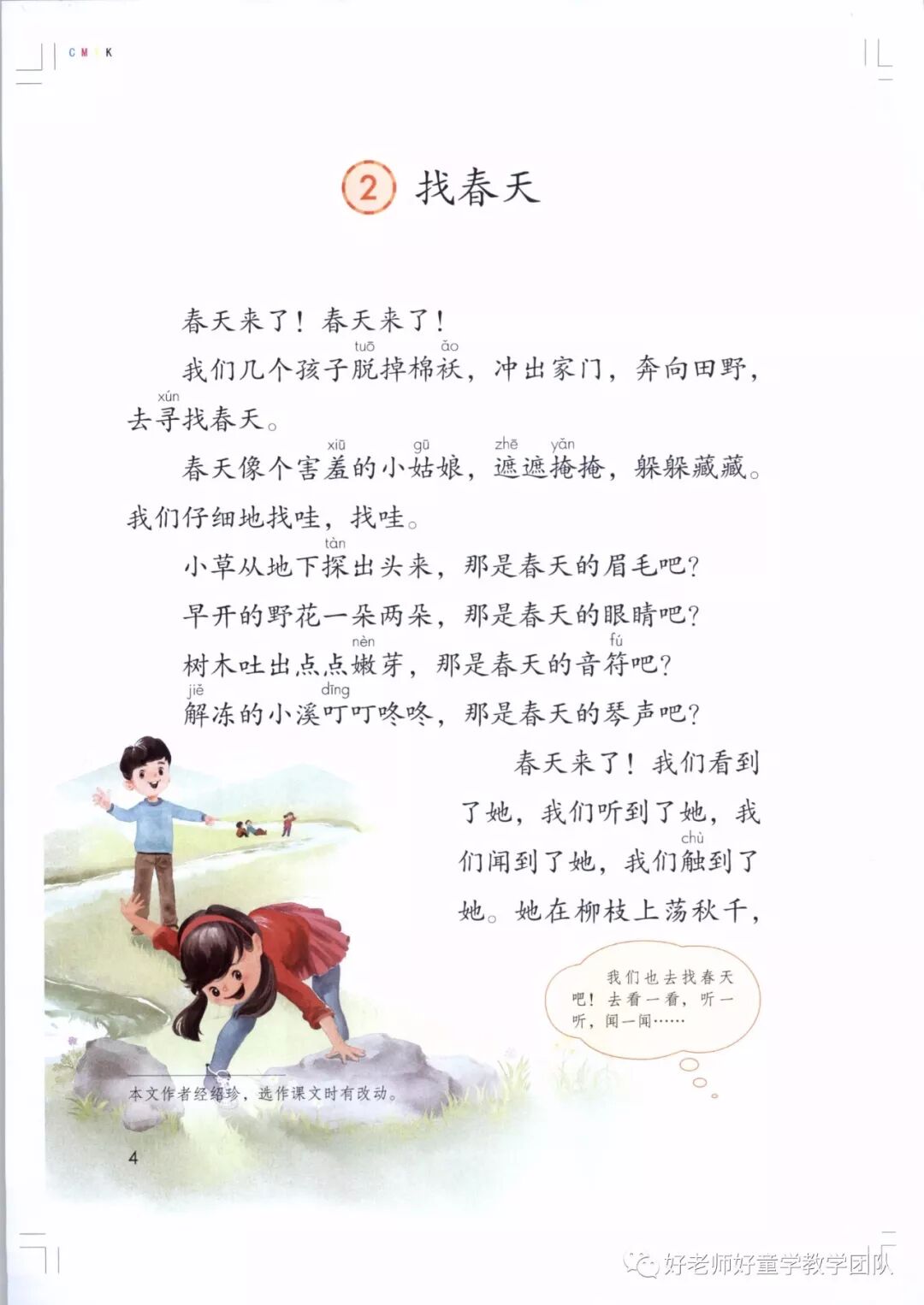 新人教版编部本于2018年春期正式使用,本册教材安排课文25篇。教材以专题组织单元,以整合的方式组织教材内容,共分八个单元:第1~4课为为“春光篇”,课文内容大都与春天的物候和热爱春天有关;第5~7课为“爱心篇”,意在培养儿童的爱心;