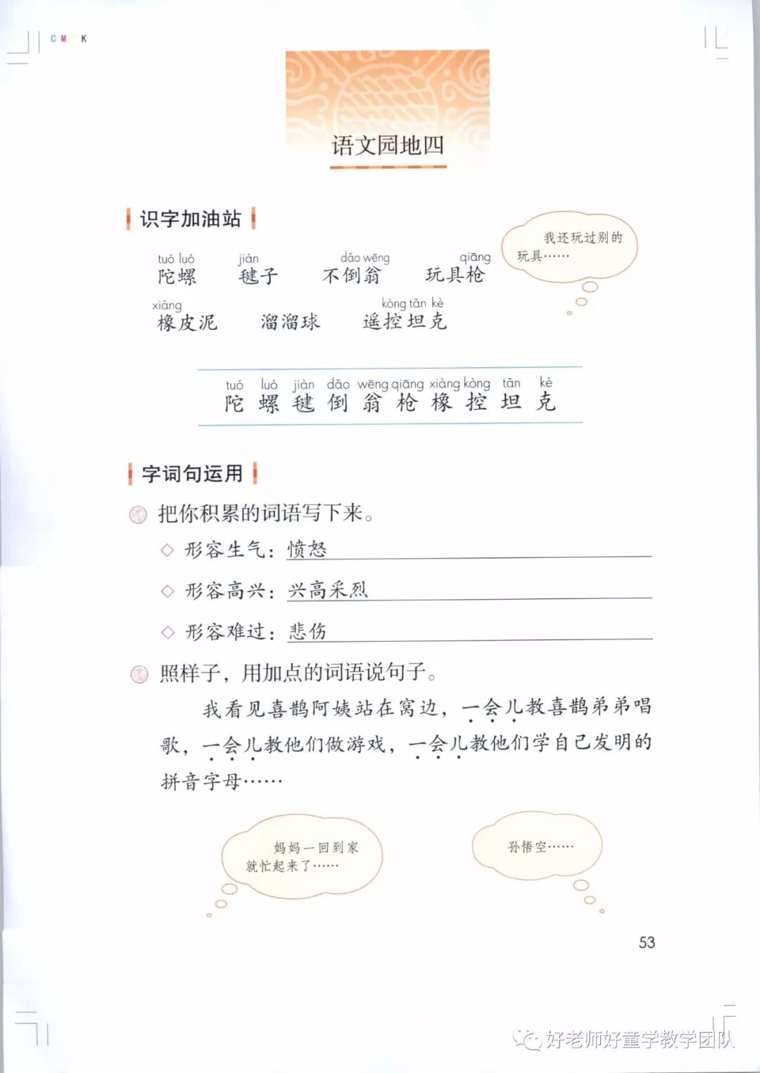 本册教材要求学生认识400个生字,这是下限,教师应该鼓励学生通过语文课本以外的渠道,增加识字量。与此同时,教师要积极提倡同学之间交流识字的方法、经验和感受,一起玩识字、组词的游戏或共同制作生字、词语卡片,促进学生在合作学习中分享识字的乐趣。