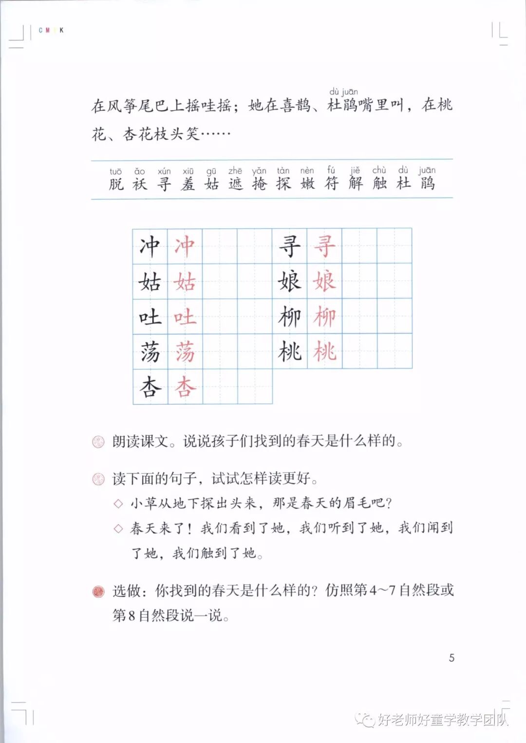 本册教科书新编选的课文,占全部课文的一半以上。有描写美好春光的,有发生在春天里的故事,有奉献爱心、关爱他人的,有反映首都新貌的,有倡导动脑动手、勤于思考的,有引导学生探究自然奥秘的,有引导学生树立良好品质、感悟做人道理的,还有介绍科学知识的作品。