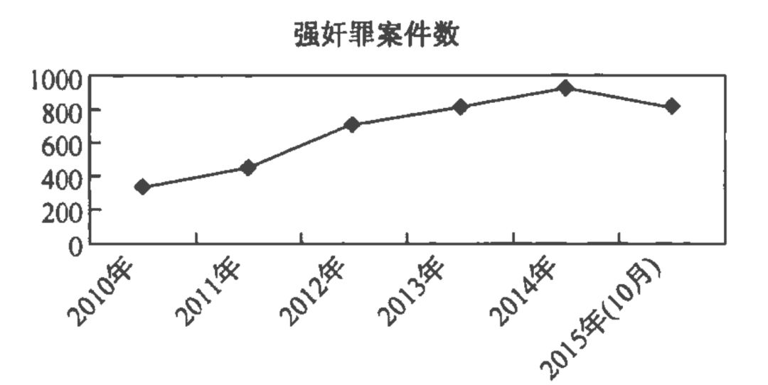 自2010年至2014年五年的时间里,有记载的强奸案件判决数依次为335起、448起、712起、813起、928起,仅2015年前10个月的案件数已达到814起,强奸罪案件判决数呈现的是逐年上升的势头。从上图得出的强奸罪案件数量的整体走势来看,我们能够从中推定奸淫幼女的案件亦呈现逐年增加的趋势。