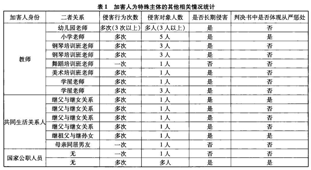 近期媒体报道了诸多教师、国家公职人员及与幼女具有密切关系之人奸淫幼女的案件,在社会上造成了恶劣的影响,引起了社会公愤,因为其已严重触碰到了社会道德伦理之底线,刺激了民众本就敏感的神经。因而笔者认为有必要对加害人的身份情况进行统计。