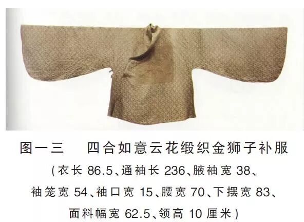 我们以王洛家族墓的王太孺人盛氏墓(嘉靖十九年,1540年)中出土的四合如意云花缎织金狮子补服为例来说明(图一三)。这件衫子面料是米黄色花缎,以四合如意云为底纹,胸前有一块织金狮子补子。花缎的经纬密为:100/35(根/cm)。衫子形制为交领、右衽、大袖衫。衣长86.5厘米、通袖长236厘米、腋袖宽38厘米、袖笼宽54厘米、袖口宽15厘米。由此可看出,嘉靖年间,衫子身长、袖肥已经成为流行风尚。