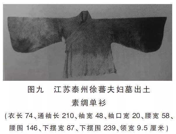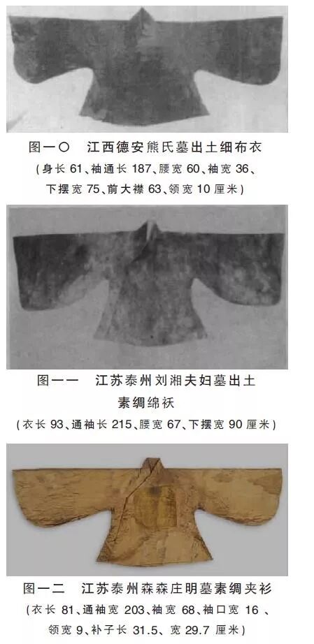 嘉靖年间衫长和袖宽的变化在出土实物中也能找到根据。对比几座嘉靖年间的墓葬:江苏泰州徐蕃夫妇墓(嘉靖十二年,1533年)(图九)、江西德安熊氏墓(嘉靖十六年,1537年)(图一〇)、武进王洛家族墓(嘉靖十九年,1540年)、江苏泰州刘湘夫妇墓(嘉靖三十七,1558年)(图一一)和江苏泰州森森庄明墓(嘉靖年间,具体时间不详)(图一二)。可以发现:衫子形制仍为交领、右衽、大袖衫。和嘉靖前的变化在于衫子的身长加长、袖子变肥。这些衫子的衣长普遍在75~90厘米左右,大约及至膝下;而袖宽多在48~55厘米,袖口宽在15厘米左右。