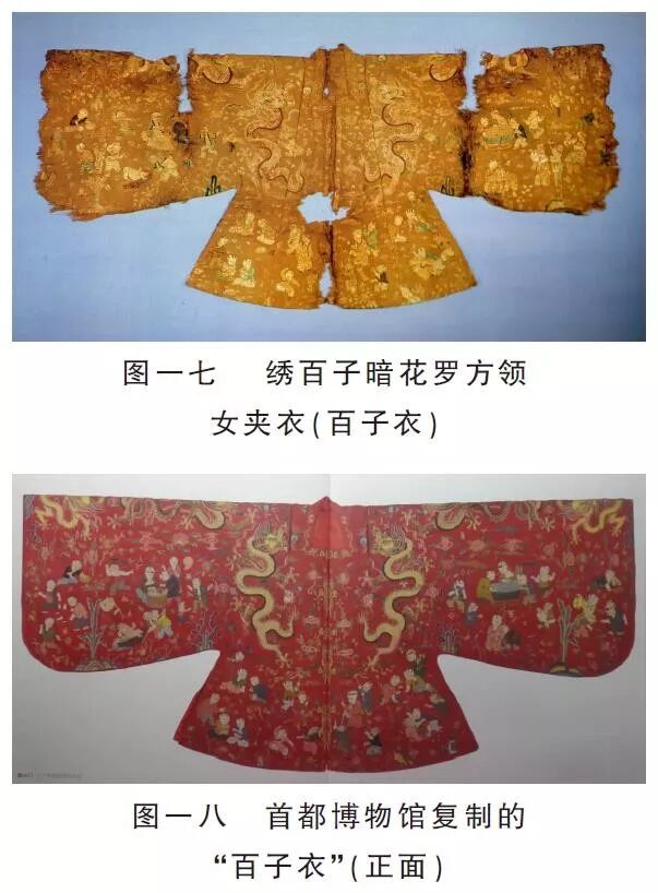 尽管这五件衫子的衣身较短(大约70厘米左右),但这并不代表着在万历年间衫子的长度在缩短。而是因为在万历年间,有两种形制的衫子同时在流行。一种是立领对襟短衫,一种是立领右衽斜襟或立领对襟长衫。 这种短款衫子的特点是:立领、对襟、镶嵌金属纽扣。类似的衫子定陵也出土了很多。比如,孝靖皇后王氏(万历三十九年,1611年)棺内随葬的绣百子暗花罗方领女夹衣(图一七),为方领、对襟、大袖,衣襟上镶嵌五对镶红宝石童子捧花金扣。这件衫子身长71厘米、通袖长163厘米、袖肥47.5厘米。它又被称为“百子衣”,衣身上满绣百子嬉戏图,非常精美,可惜原物残损较重,好在首都博物馆曾复制过一件,使得我们能够一饱眼福(图一八、图一九)。