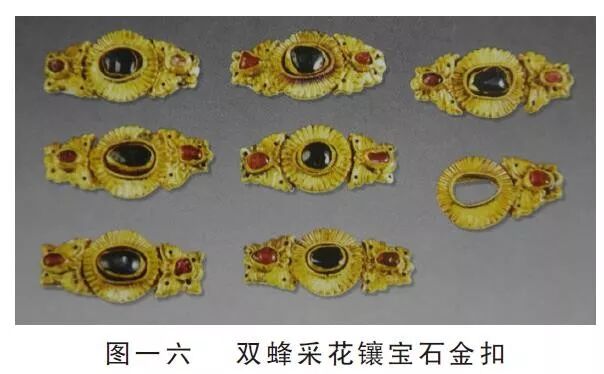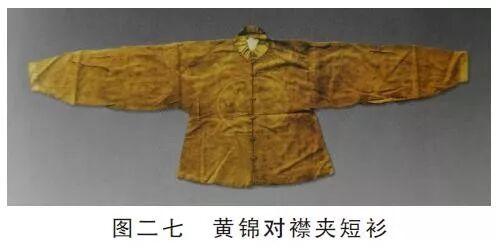 到了万历年间,衫子的袖子开始变窄,并且渐渐趋于直袖且不做收口,而领子则变为立领、对襟。在江西南城明益宣王继妃孙氏墓(万历十年,1582年)中出土了5件短衫,其中只有一件黄锦右衽衫为圆领、右衽、直袖(图一四),其余四件都为立领、对襟,大袖。但是这里“鱼肚袖”的弧度已经大大变小,接近直袖了,比如黄锦绣花对襟夹短衫(图一五)。这四件立领对襟衫还有个共同点就是衣襟上都钉了7副双蜂采花镶宝石金扣(图一六)。