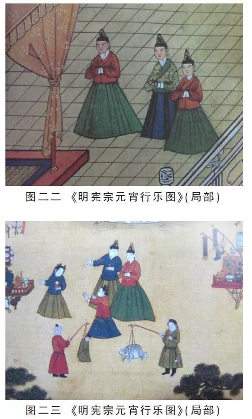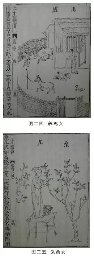 明代妇女的基本衣着形式为上着短衫,下着长裙。《明宪宗元宵行乐图》(图二二)为我们展示了成化时宫廷妇女的穿着打扮,我们可以看到,宫中的妇女装扮一律是:头戴尖尖的髻,身穿交领右衽广袖齐腰短衫,下着长裙。就连儿童也是这种穿着,只是发型不一样罢了(图二三)。在明中期以前,这是妇女的固定穿着搭配,不管身份地位高低,皆是如此。《三才图会》中刻绘的劳动中的妇女,服饰也是类似的装扮,只是不用髻(图二四、图二五),因为髻是命妇以上身份的妇女才能使用的。