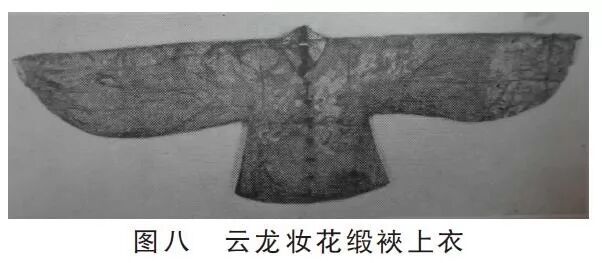 浙江杨家桥明墓(天顺年间)(图六)、江西宁靖王夫人吴氏墓(弘治十五年,1502年)和戴缙夫妇墓(弘治十五年,1502年)(图七)出土的女衫形制皆为交领、右衽、大袖衫。衫长及腰(这些衫子身长为60厘米左右);袖子为典型的“鱼肚袖”,袖宽35厘米左右,袖口有收口,袖口宽11-17厘米。这三座墓中,吴氏为亲王夫人,其余两人皆为命妇,但她们的衫子在形制上并无太大差别,只是在面料和纹样上区分出身份等级。吴氏的衫子皆为各色织金妆花缎、绢或云布,而另外两人衣服的面料是白棉布。 这种衫子的形制到了正德年间开始出现变化,变为立领、对襟。已发掘的正德年间的明墓只有北京南苑苇子坑夏儒夫妇墓(正德十年,1515年),可从该墓出土的女衫上看到这一变化,但是发掘简报里没有提供尺寸、材质等更多的信息,我们只能从模糊的图片上观其一二。比如这件云龙妆花缎裌上衣(图八),为立领、对襟、大袖短衫。袖子为“鱼肚袖”,尺寸不详,但目测袖宽应和弘治年间的衫子差不多。这是出土最早的立领对襟衫,且衫子上有六对明显的扣眼,然而在墓中并未出土纽扣,这座墓被盗过,怀疑纽扣可能被盗。这件衫子的纹饰为“云龙纹”,这显然是僭越(正德年间僭越之风颇为兴盛),也有考古人员认为这些服饰可能是朝廷的赐服。