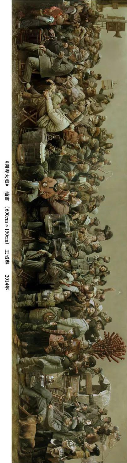 在我的记忆里,少年时代最大的快乐莫过于农村唱大戏,七十年代末期农村庙会开始恢复,唱大戏这种古老的娱乐形式开始在一些村庄出现,也就是在那个时候我开始了与农村老戏牵扯不断的情愫,正是那些活泼艳丽的戏台场景激活了我喜欢绘画的兴趣,也开始了我一生难以割舍的艺术追求。记得大概是10岁左右,父亲带着我到六里之外的杨营村看了第一次大戏,我真不知道怎么形容那时的快乐心情,只记得首次见到的那台戏,是有关樊梨花刀劈杨藩的故事,后来才知道那叫《反西唐》,我惊诧于那鲜亮繁密的戏剧服饰和奇异灵动的人物脸谱。铿锵的锣鼓,骚动的人群,兴奋的表情,陌生的眼神,一切都是那么新奇,从那时开始我的内心里开始涌动着一种表现的冲动,试着涂抹,追摹着心中形象,我也渴望着站在戏台前的那份热情。对戏剧的热爱日复一日,有时候也有了想学唱戏的冲动,但更多时间我喜欢观赏戏台上的那些情节和场景。创作这幅作品,是我对印象中乡土戏剧的一次记忆复原,也是对远去故乡的一次深情眷顾。这幅画安排了108人,也许我是梁山人的缘故吧!