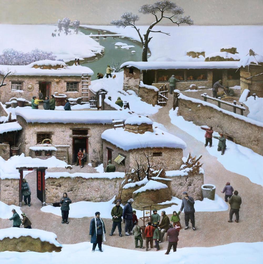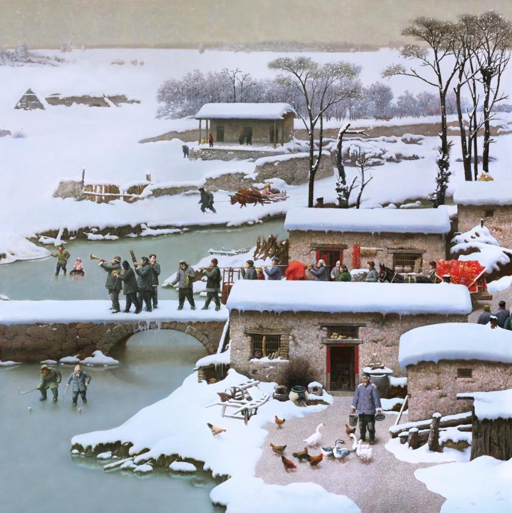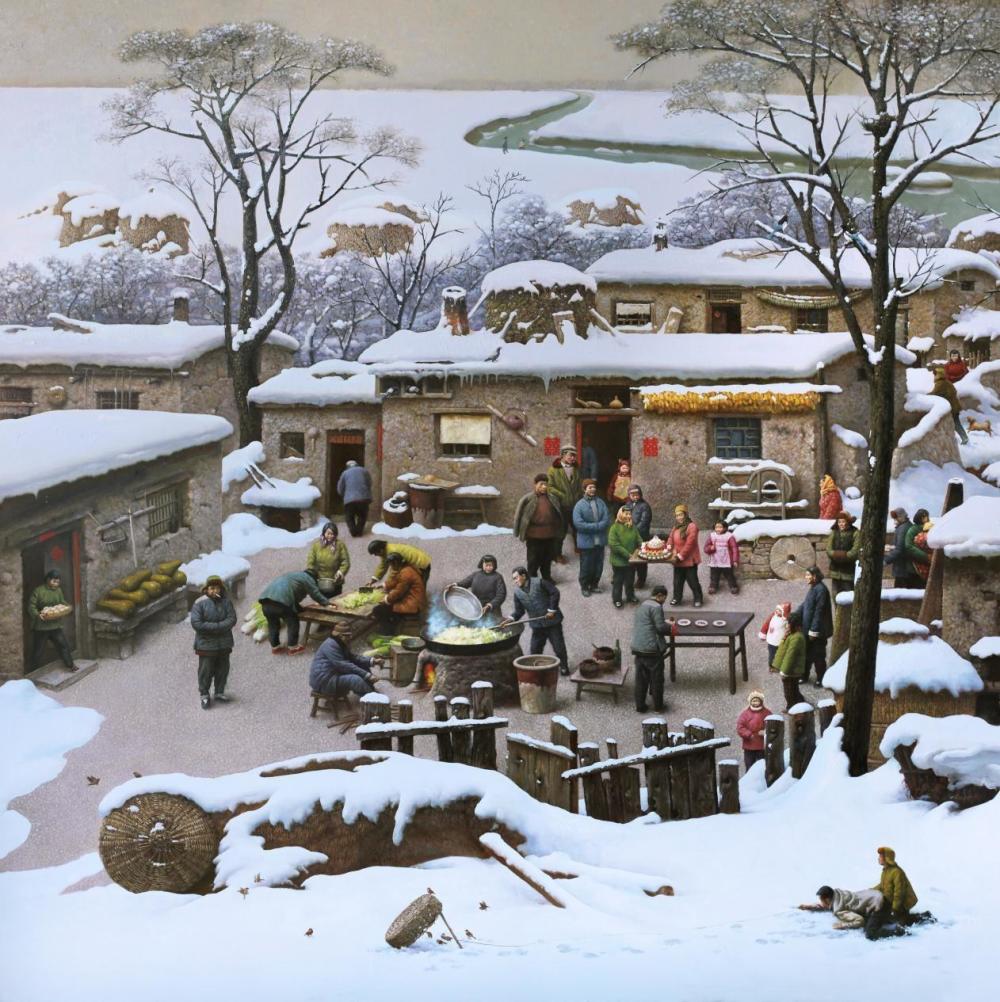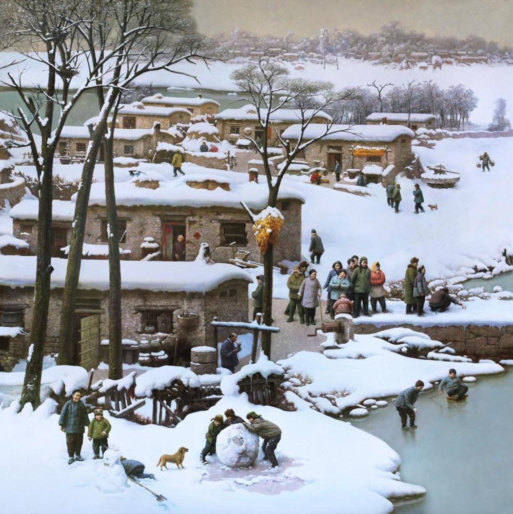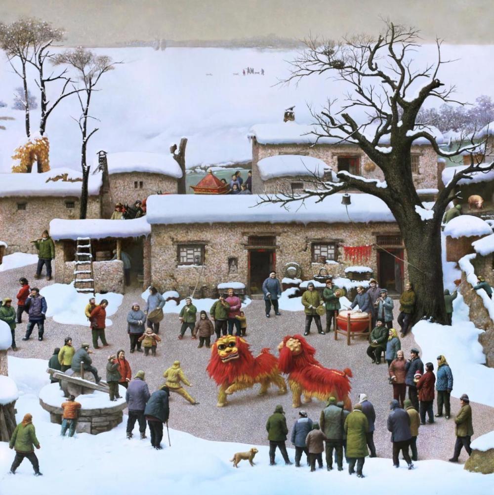 思绪一旦开启,那些曾经与故乡割舍不开的风俗物事,年少生活,一随风雨到心头,渐渐地画面感开始丰满起来。童年的苦涩自不待言,而童年的幸福绕不开对新年的期盼。新婚的车队,看热闹的人群挤满街道。鼓乐喧天,舞狮的场面,溜冰、堆雪人、捕鸟的孩子们……还有各式各样的农具、家禽牲畜……