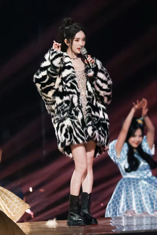 舞台上,杨幂穿着一身“夏冬混搭”,内穿一件亮片低胸短裙,外套一件黑白相间的绒毛大衣。