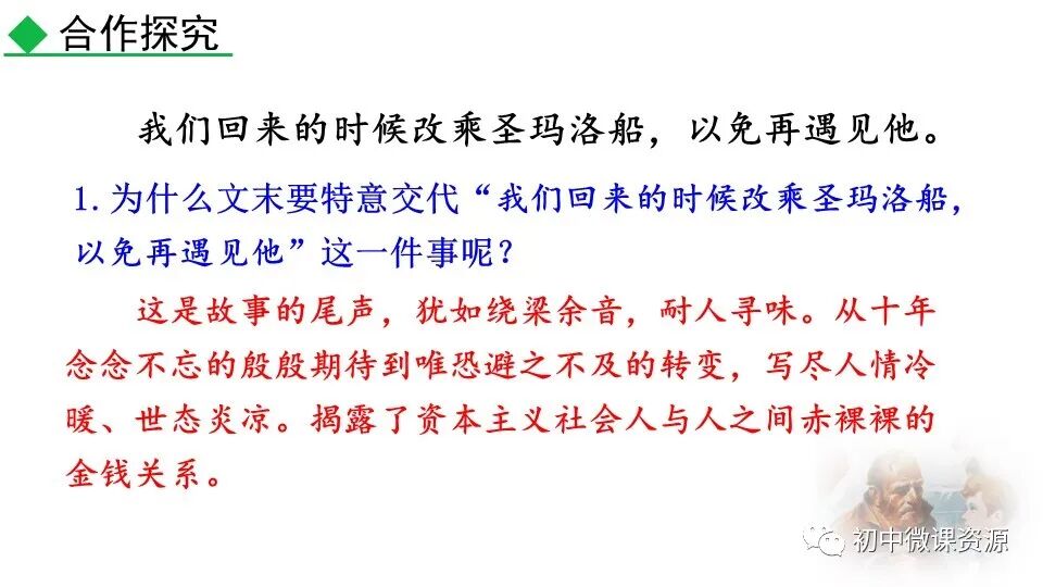 悬念四:小说笔锋一转写菲利普夫妇一家旅游,在船上见到很像于勒的卖牡蛎的老水手。我们不禁要问:这真是于勒吗?