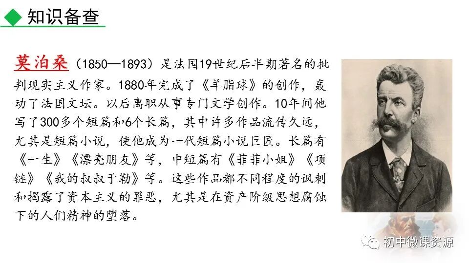 莫泊桑(1850-1893),是法国19世纪后半期著名的批判现实主义作家。1880年完成了《羊脂球》的创作,轰动了法国文坛。许多作品流传甚广,尤其是短篇小说,使他成为一代短篇小说巨匠。长篇小说有《漂亮朋友》等;短篇小说有《项链》《我的叔叔于勒》等。这些作品都不同程度地讽刺和揭露了资本主义的罪恶,尤其是在资产阶级思想腐蚀下的人们精神的堕落。