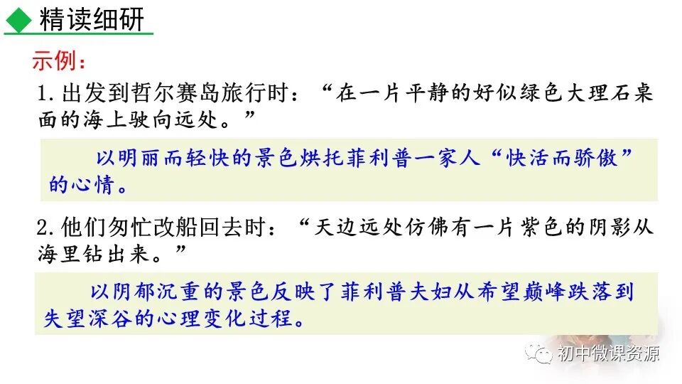 “紫色的阴影”语意双关,既实指哲尔赛岛,也象征蒙在菲利普夫妇心头的阴影。此处的自然环境描写烘托了人物失望、沮丧的心情。与刚上船时的心情形成鲜明的对比。
