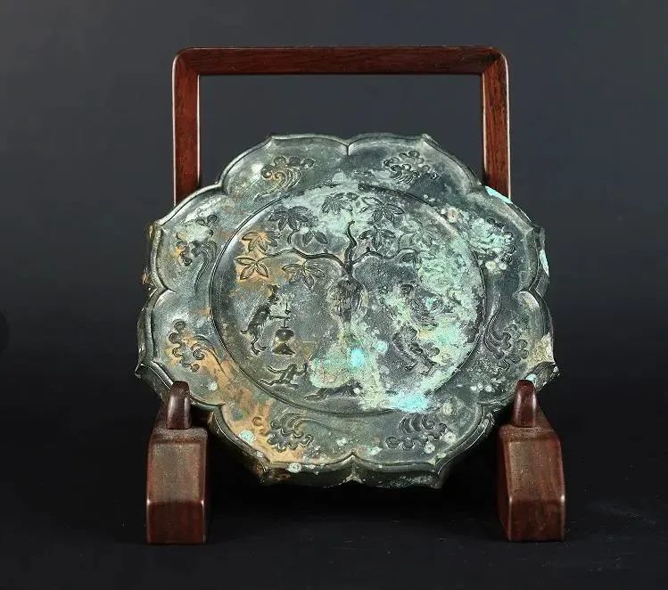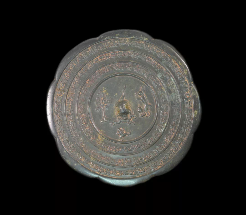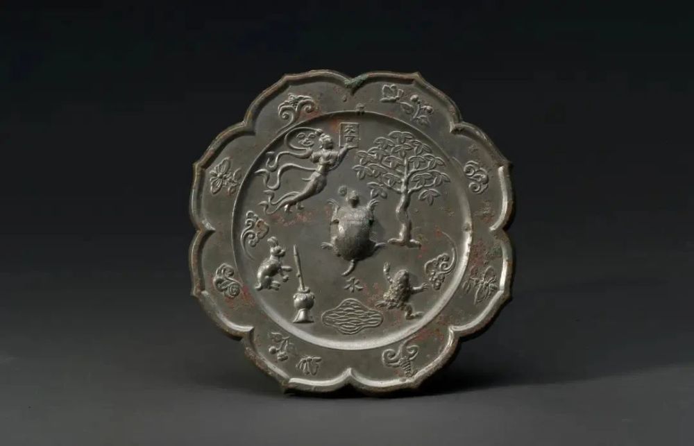 月宫故事是唐代流行的铜镜纹饰题材。在这一面唐代的月宫菱花镜上,左上方为凌空飞舞的嫦娥,体态修长,帔帛随风飘舞,与唐画中的飞天相似。她左手持“大吉”牌,右手托果盘,其下方是玉兔与杵臼,右上方有桂树,树下是跳跃的蟾蜍。桂树、嫦娥、蟾蜍、玉兔都是中国古代关于月亮的经典意象,常用来指代明月。