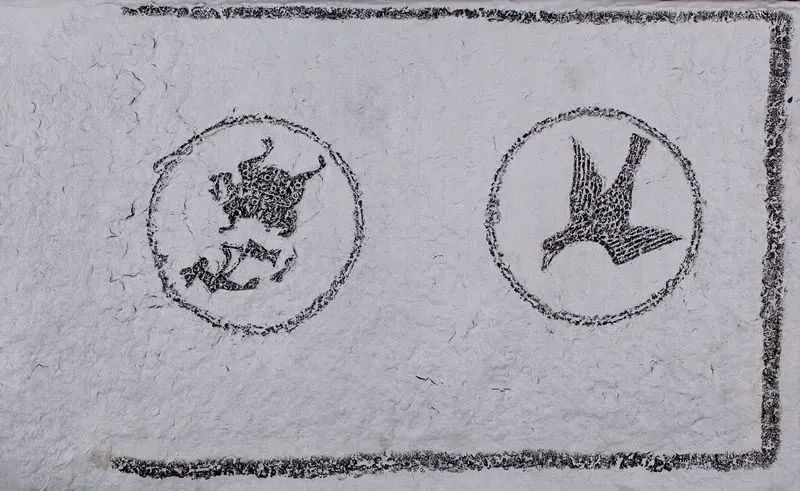东汉日月同辉龙戏图画像石,整体呈梯形,画像石侧面雕刻的是龙戏图,底部则采取分格布局法雕了一组日月图案。大家可以看到左侧代表月亮的圆形图案中刻画了玉兔捣药和蟾蜍图案,右侧代表太阳的图案里面雕刻了金乌图案。画面采用剔地浅浮雕,局部阴浅刻,技法娴熟,画面舒展流畅,形象逼真生动。