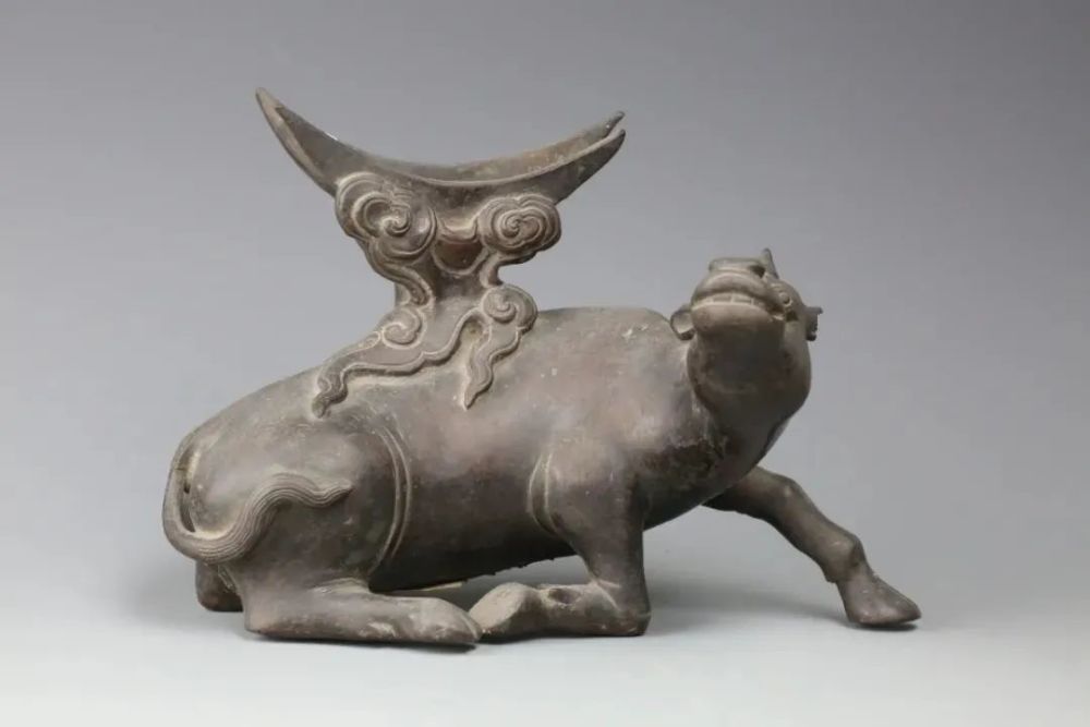 这座铜镜架,是用来放置铜镜的,将“犀牛望月”的场景真实还原,架子的部分刚好成为一轮弯月,造型如此优美,线条细腻。