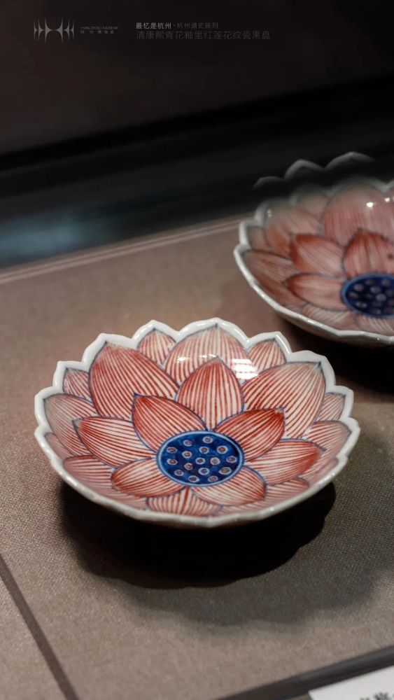 清代 康熙款青花釉里红莲花形瓷盘(杭州博物馆藏)