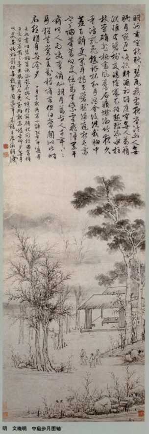 除了这两句诗外,当夜的场景也被画中主人记录下来,这便是南京博物院所藏文徵明《中庭步月图》。以庭院月光为题材的作品在我国历代绘画中颇为少见,尤其以文人士子月夜访谈为主题进行绘画创作,更为罕见。