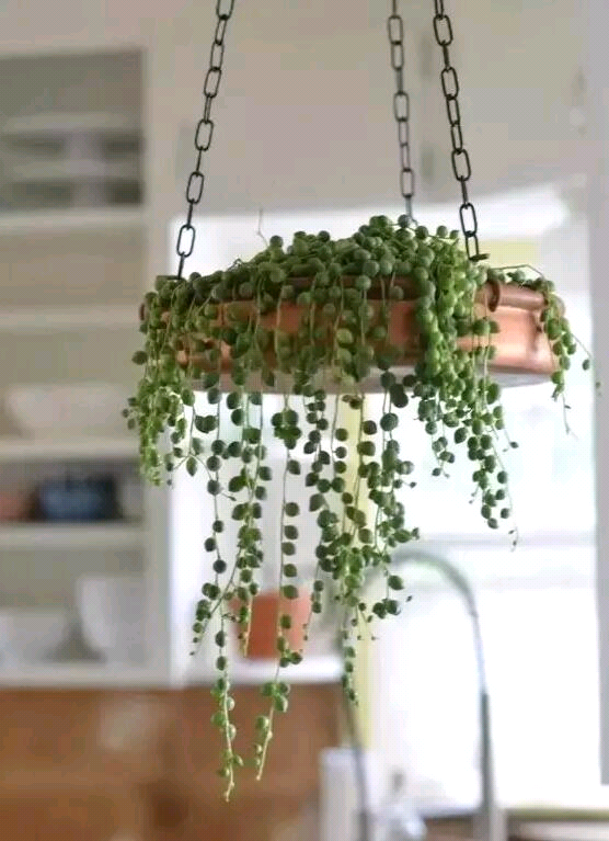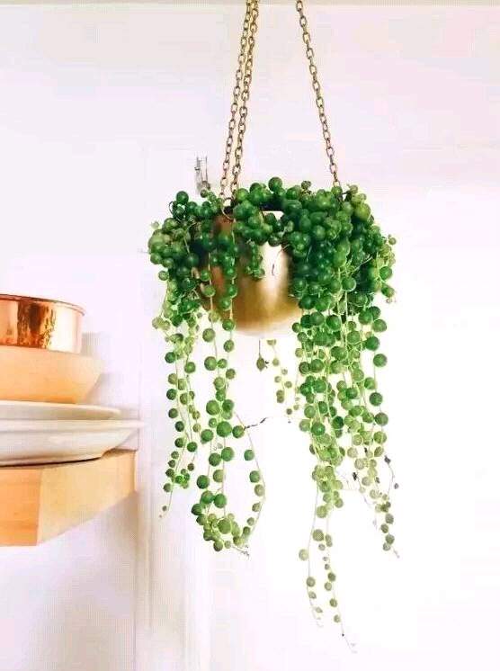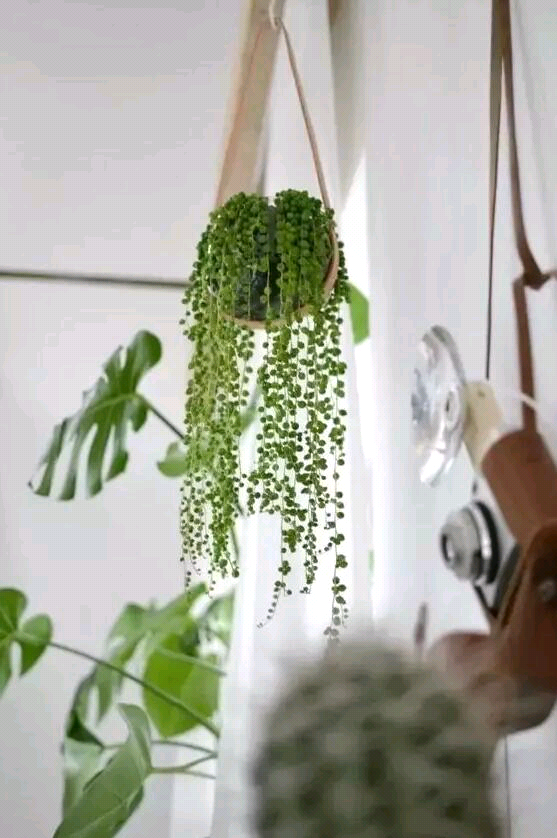 珍珠吊兰最好悬挂生长,给它足够的生长空间。挂在客厅里,或是餐厅的墙面上,一定会让你的家生机盎然。