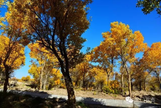 装扮得美丽如画,湛蓝的天空与金黄的胡杨林