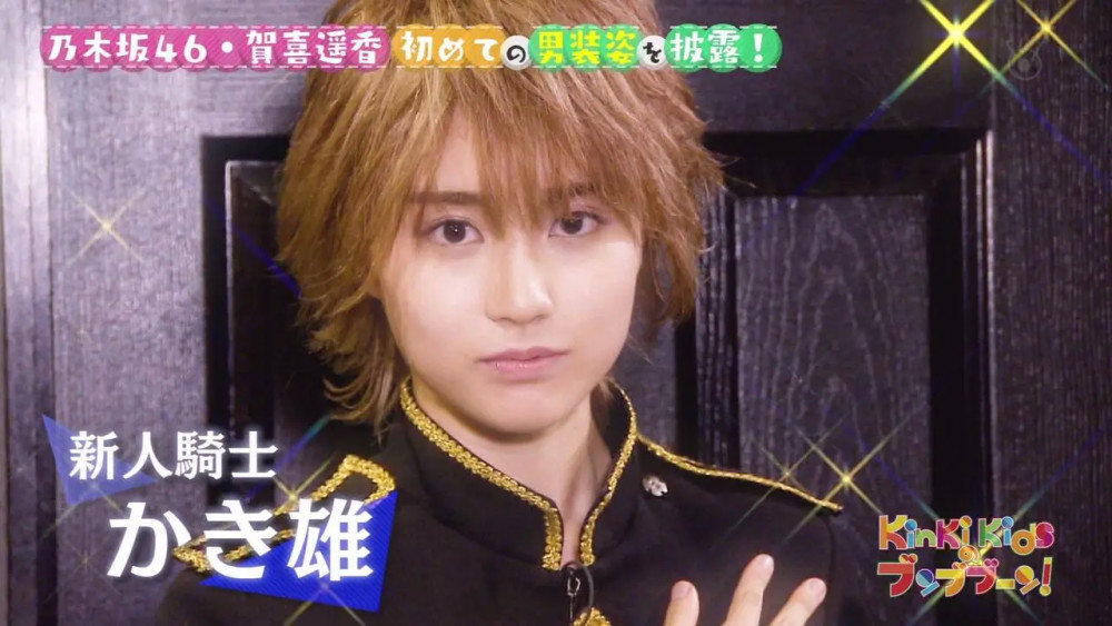 由于贺喜遥香出色的外表,在整个团队中她也被戏称为帅哥。偶尔男装打扮的贺喜遥香也是相当的帅气。