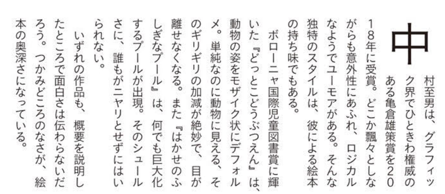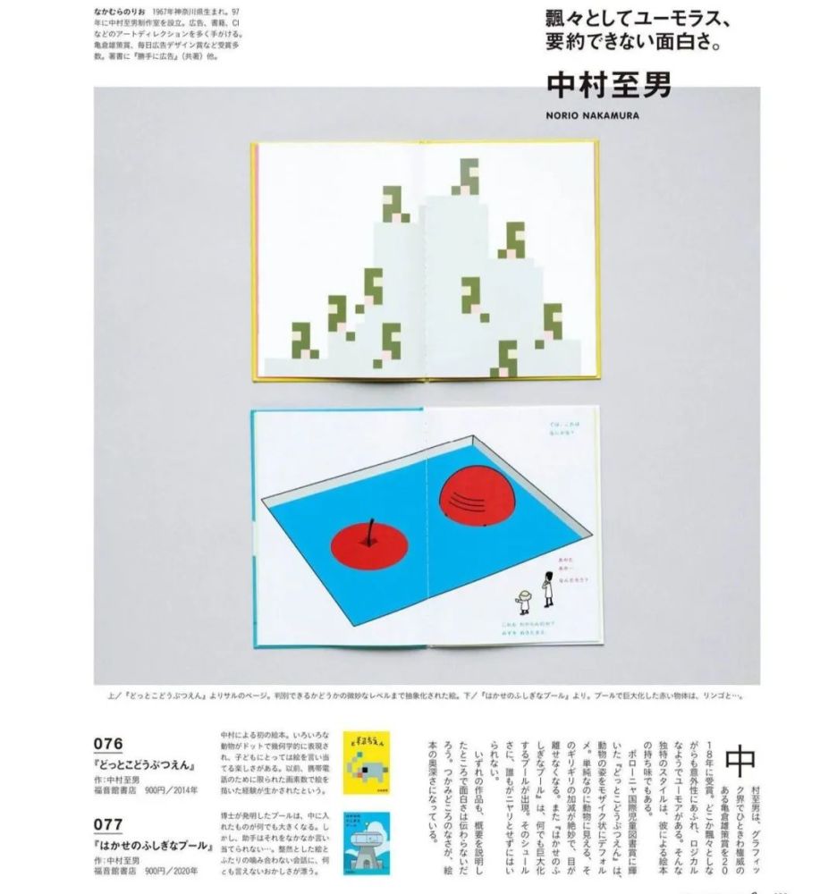 中村至男は、グラフィック界でひときわ権威のある亀倉雄策賞を2018年に受賞。どこか飄々としながらもう意外性にあふれ、ロジカルなようでユーモアがある。そんなん独特のスタイルは、彼による絵本の持ち味である。