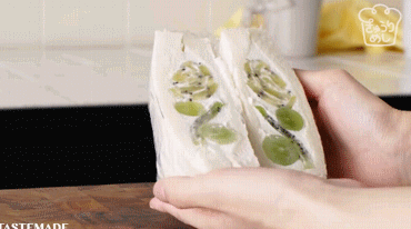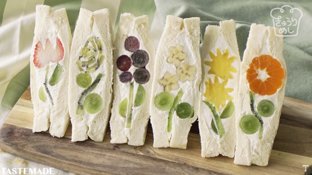 来自日本的博主きゅうりめし,采用新鲜的水果食材,自制奶油,搭配草莓,橙子,猕猴桃、香蕉,提子,芒果等水果,创造出不同口味的 “鲜花三明治”。