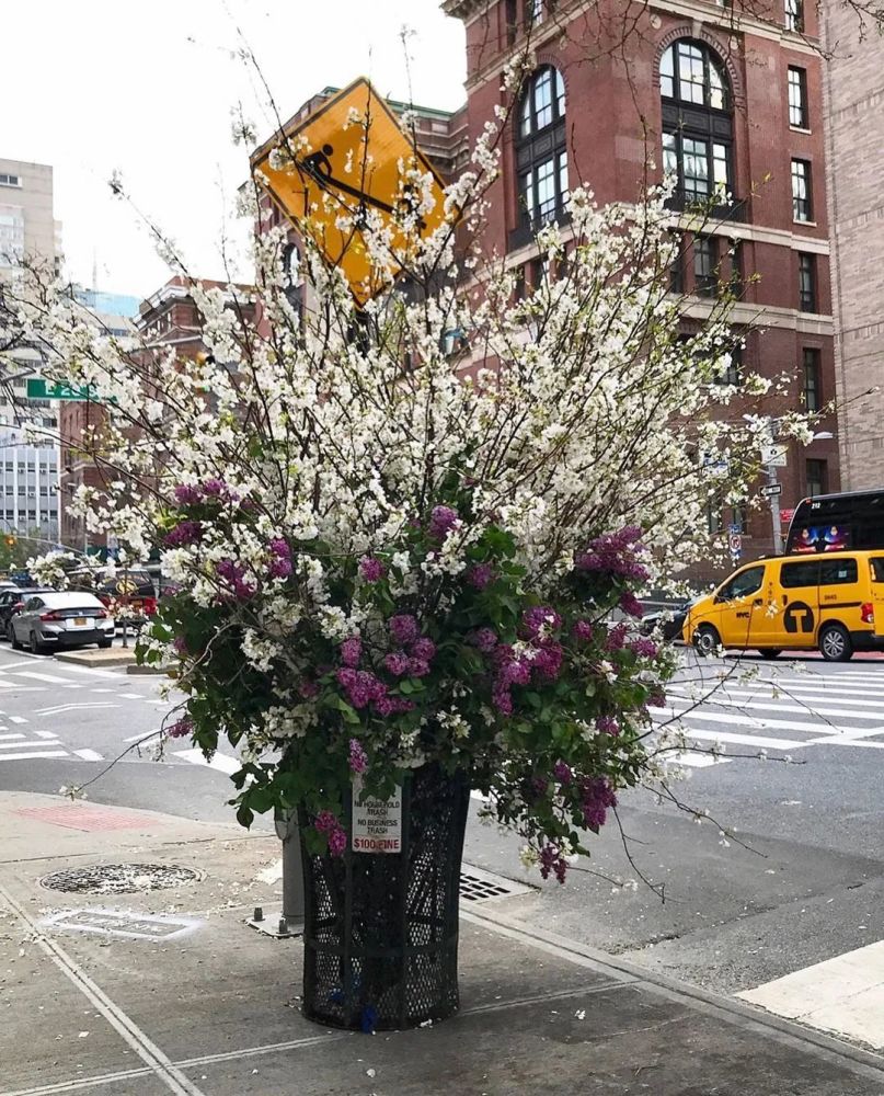 在最近疫情蔓延的这几个月里,Lewis 把纽约健康中心周边的垃圾桶都改造成了 “花瓶” ,装上鲜花,让路过的医护人员感受一年最美的春季。