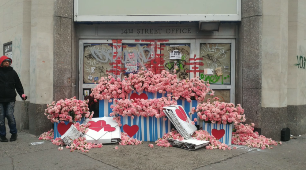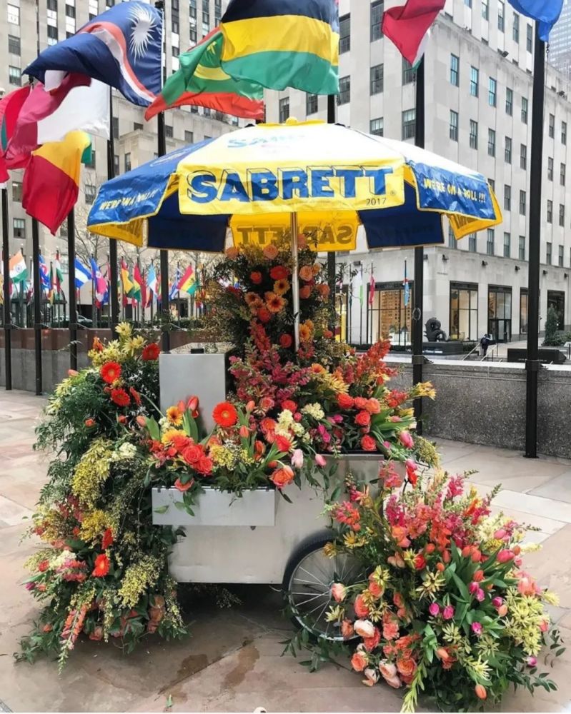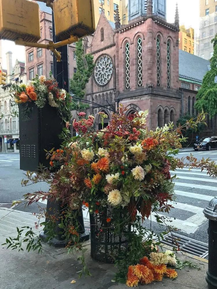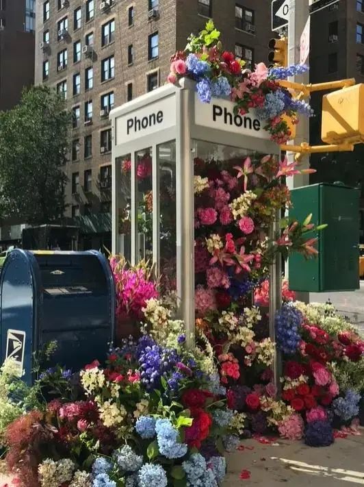 喜欢把大量荒废的鲜花装饰在垃圾桶、电话亭、废弃的摊位等城市装置上,让城市里的任意地点开满鲜花。