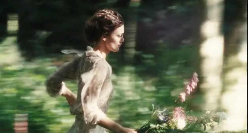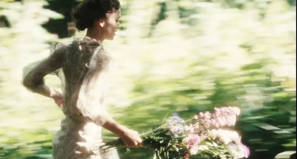 《赎罪》中,凯拉·奈特利扮演的女主塞西莉亚拿着鲜花,奔向心爱的人。