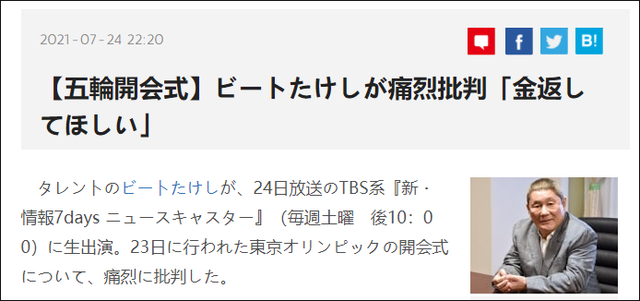 搞艺术的,对艺术的要求就很高。而这次日本东京奥运会的开幕式,用北野望的话说就是:灾难!他毫不客气地痛批东京奥运会开幕式。北野望说:昨晚的开幕式,真是有趣啊,因为我睡得很香!出乎意料,希望她们把钱退给我!