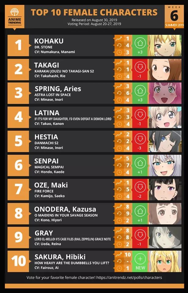近日,外媒Anime Trending公布了关于第六周夏季新番动画的女性角色人气排行榜,意外的是《新石纪》的琉璃成功打败了《擅长捉弄的高木同学》的西片太太,成功夺得了第一,以下为本次“老婆榜”的详细排行。
