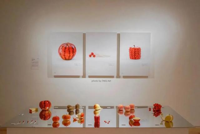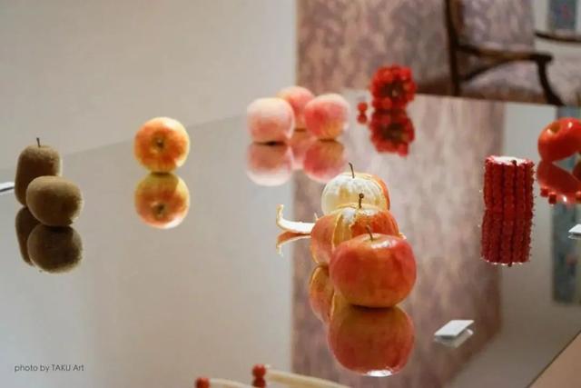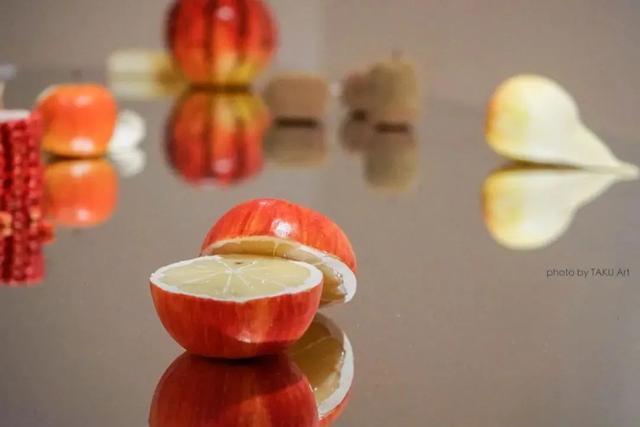 她的作品是以装置为主,将西瓜、橘子、豆类等十个种类的水果跟苹果的外形相结合,观者一边感受味觉的预测和视觉的偏离,一边想象苹果的味道。
