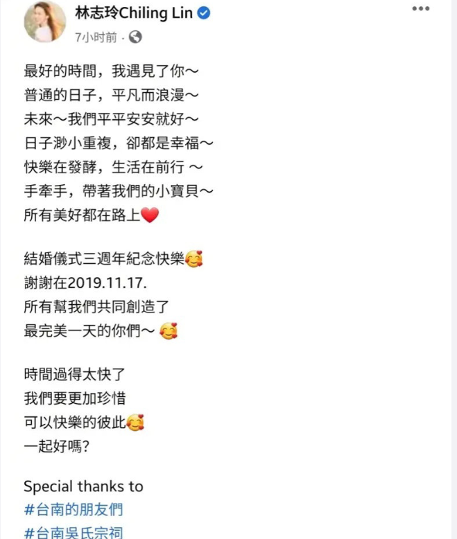 11月17日,是林志玲和黑泽良平结婚三周年的日子,林志玲在社交软件上发文纪念结婚三周年: