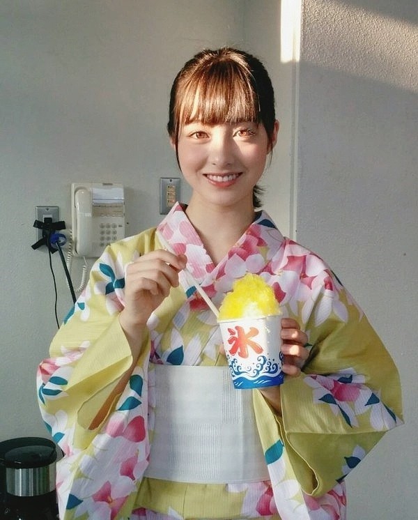 一身传统和服,黄色主调,上有樱花图式,浓密的齐刘海,扎起的马尾,整个搭配造型优雅美丽,超级温柔的日本女性的美丽展现出来,同时不乏少女感。