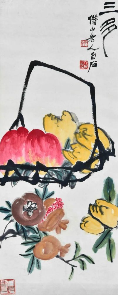 作品从书法和笔墨上看,应归属于齐白石40年代中期作品。“三多”为篆字款,笔力遒劲。这个时期,齐白石的作品创作已趋于成熟。桃子的造型夸张,以没骨法写成,色彩饱满,朱红色的大桃,配以藤黄表现出具体形貌,鲜艳欲滴。运笔以桃尖为起点,大笔侧锋向桃蒂方向扫去,因之边缘出现浅色的洇晕,更显娇嫩水灵。竹篮纯以水墨,笔力雄肆,与桃实形成线与面、墨与色的强烈对比,将桃实的丰硕结实之感淋漓尽致地突显出来。佛手较早点佛手画法,采用没骨法写成,用藤黄染佛手果。三个石榴石榴,呼应得体,自然随意。作者正是通过用笔的使转中侧,用色的浓淡干湿,构图的协调统一,使整幅作品显得非常舒服。