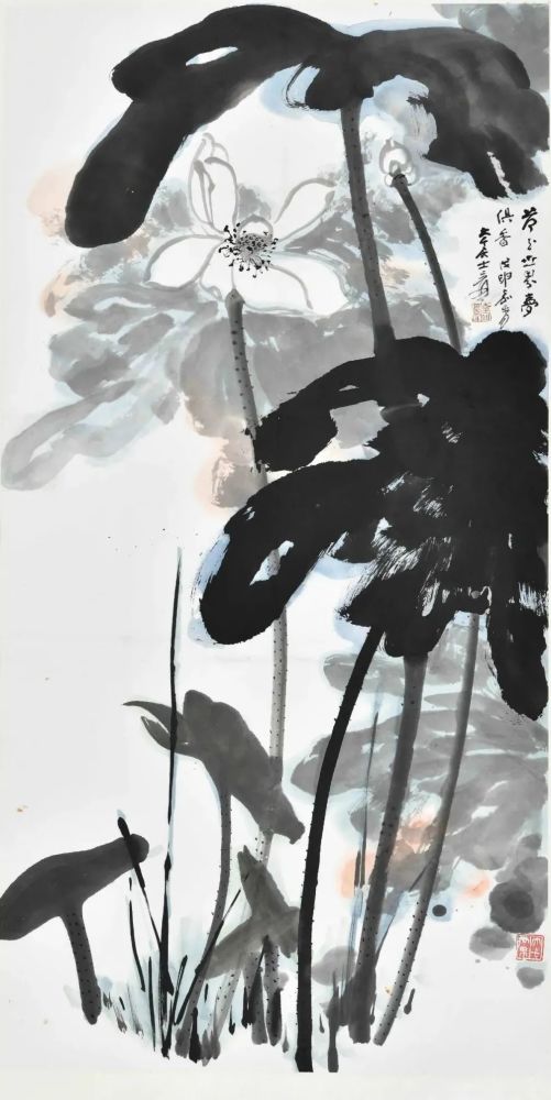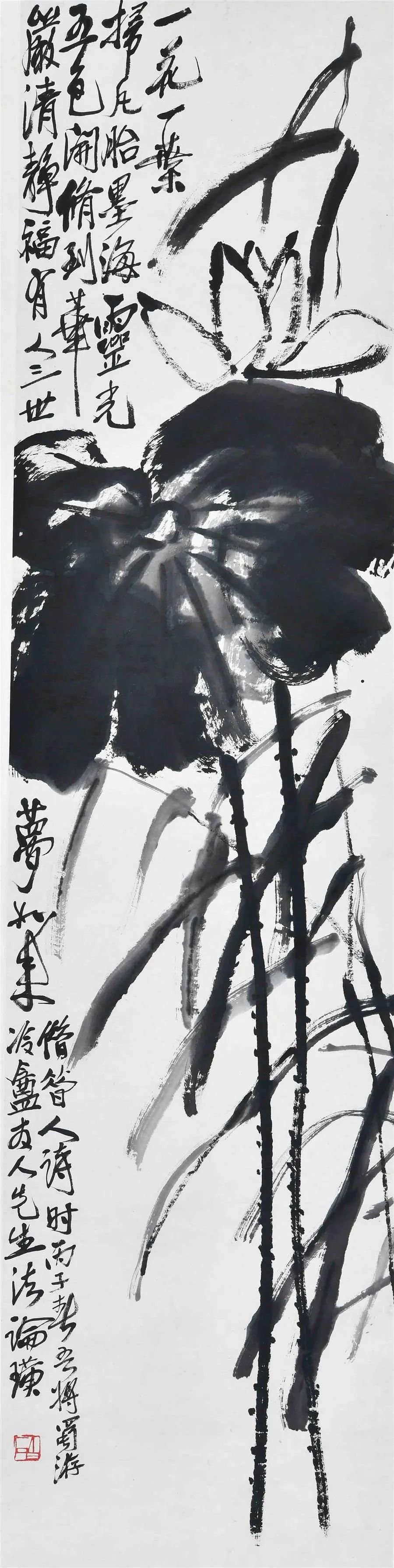 《墨荷》是齐白石赠予胡佩衡的作品,画中的上款人“冷盦先生”,即指胡佩衡。胡氏在《齐白石画法与欣赏》中写道:“他(齐白石)给我画过一幅墨荷(此画),使人看着仿佛是绿色荷叶、粉白色的花,上题古诗‘一花一叶扫凡胎,墨海灵光五色开’,来说明用墨的恰到好处,能把各种颜色画出来,也能把自己的感受画出来。老人作画,用墨和用水是极其有分寸的。”在此幅作品中,齐白石以浓墨写出荷叶、荷茎、荷花,荷叶墨气氤氲,荷茎苍劲挺拔,荷花悄然盛开;复以枯润有别、浓淡有致的笔墨写杂草,整体上布局合理,既富有凝聚感,又杂而不乱。用笔大气磅礴、浑朴老练,富含金石味。虽没有赋彩填色,却深得墨分五彩之神趣,显示出画家举重若轻的笔墨功力。