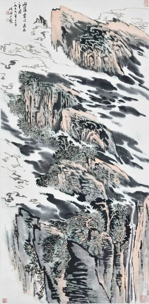 全图气势恢弘、笔墨雄劲,动静相合,极具意趣。所绘云水,映带呼应,具有极富生气的动态之美;所绘山崖丛树,更是行行相关,聚散结合,参差映带,葱茂苍翠,颇得自然之趣。作者在用水墨和颜色创作时留出了白色的空间,用以表现云雾,然后用浓墨积点成块,以反衬“留白”。他又用较细的拖笔中锋画云的阳面,以较淡而毛的环曲线条勾云的阴面。在灵变的意韵中,蕴含着一种清新隽永、古拙奇峭、超凡脱俗的意趣。图中山峦树石与云海是动与静、柔与刚、疏与密、虚与实的强烈对比。气势磅礡又不失装饰味,更富内涵素养。
