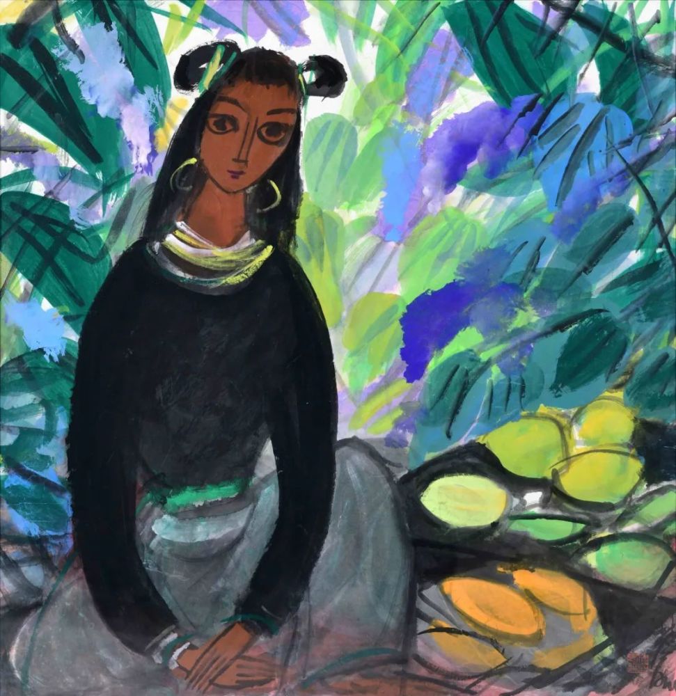《夏》是林风眠仕女题材中甚为罕见的充满异域和热带风情之作,色彩明丽鲜亮,斑斓的阔叶花卉与成熟丰盛的水果,围绕一个散发着浓郁而大胆的野性之美的少女。林风眠的仕女多是静穆的、娴雅的和独自美丽的模样,尤其古装仕女更是温婉恬美,而《夏》中的少女,像是少数民族又像是南方热带地区的女子,那黝黑的皮肤,传情的大眼睛,异于中原传统样式的服饰妆扮,别有一种野性热烈的美感,令人不由得联想起高更笔下代表“原始、自然、生命”的大溪地女子。也许饱受苦难折磨和创作压抑的林风眠,在定居创作环境宽松的香港后,终于有了无拘无束的释放空间,而人到晚年也更向往青春和生命活力,所以《夏》的色彩比以往作品更明亮强烈,形式更任意恣肆,可谓画家内心对生命热情的呼唤。