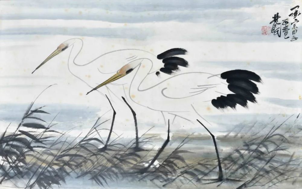 林风眠喜爱临摹自己的作品,根据回忆作画。白鹭鸶就是他最擅长的题材之一,虽然相同的题材风格不断的重复,但是他的色感、手法、造型越发成熟。席德进曾说:“林风眠在表现手法上是单刀直入,绝不迟疑,以闪电般的速度,在纸上留下慑人心魄的动力,迫使你感受他个性化的风格。”这话用来形容这幅作品中的白鹭恰如其分,双鹭形象刻画寓繁于简,造形笔法以至设色,几以提炼到无法可循的境地。