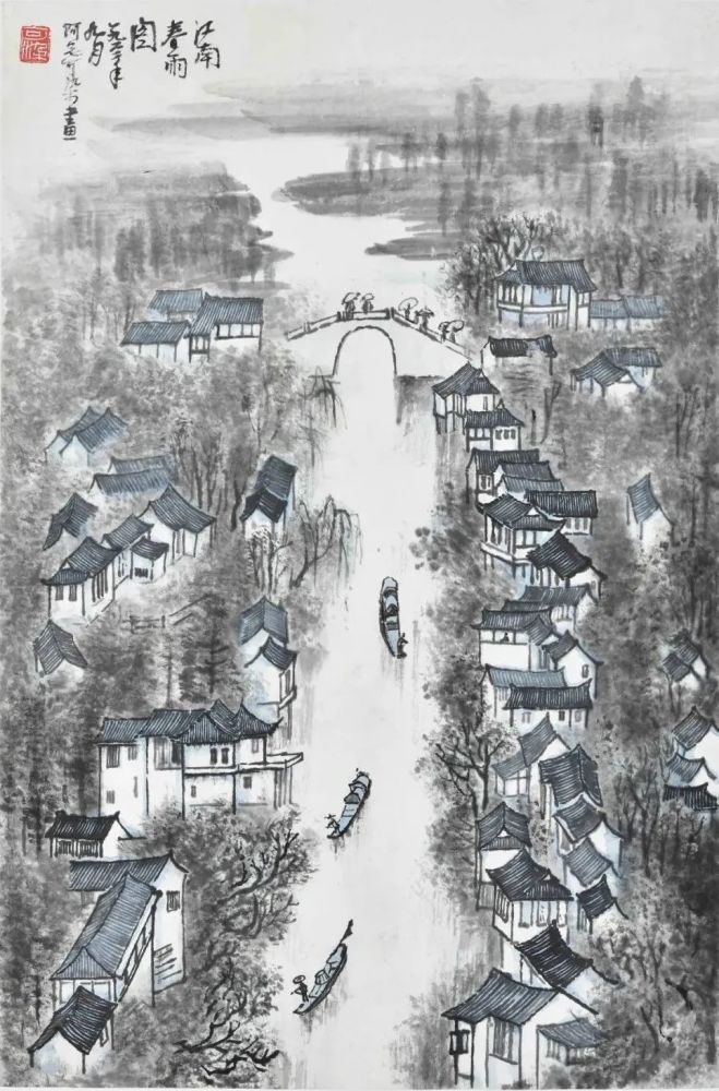 题识:江南春雨图。一九六二年九月,阿兄可染画。