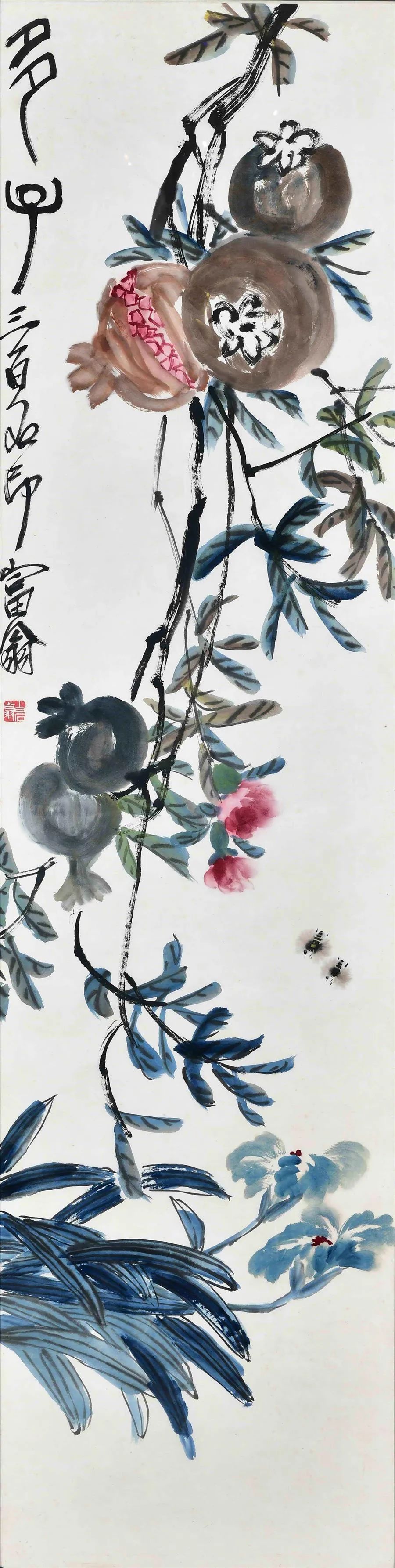 故善画者青绿斑斓,而愈见墨彩之腾发。吴昌硕正是这墨彩之腾发的实践者和成功者。他虽主张作画不可太着意于色相之间,但他始终都在实践着画中色彩的裂变与生发。自古画家皆知用色易俗不易古之理。在清代之前,文人水墨画家居多,而施彩者甚少,重彩泼墨者则更少。至清末,西方色彩传入我国,其艳丽浑厚的红色则略胜胭脂而受到中国画家的喜爱,故名西洋红。先生慧眼识色,画作中大量的运用西洋红于他的大块泼墨写意蟠桃之中,开创了一片古意盎然、生机蓬勃的新篇章。另一方面,绘画中的线条一直是画家引以为豪传统书法功力的体现。画家强调了画面中枝干书法线条的挺拔劲健,正是笔力的厚重支撑住色彩的艳丽夺目,使得全画生机盎然,韵味十足。