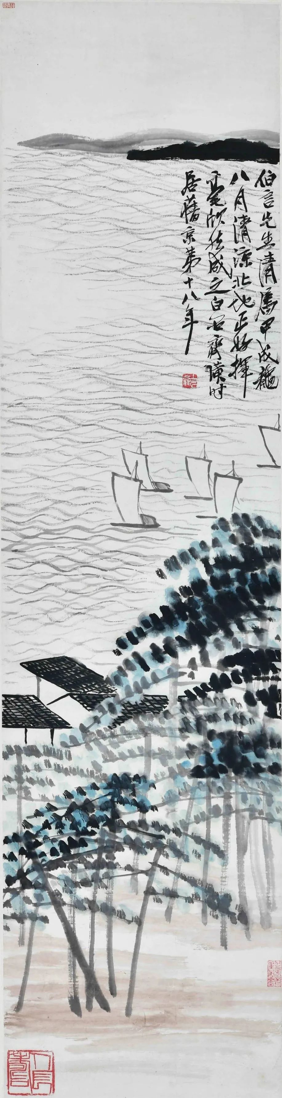 《湖光帆影》作于1934年,正是白石翁历经衰年变法,大器终成之时,可谓齐白石山水画的重要作品。本幅原由北京文物公司旧藏,曾于1987年参加日本西武美术馆之展览。1987年,日本西武美术馆、读卖新闻社在西武百货店举办了“齐白石画展”并出相关作品集。