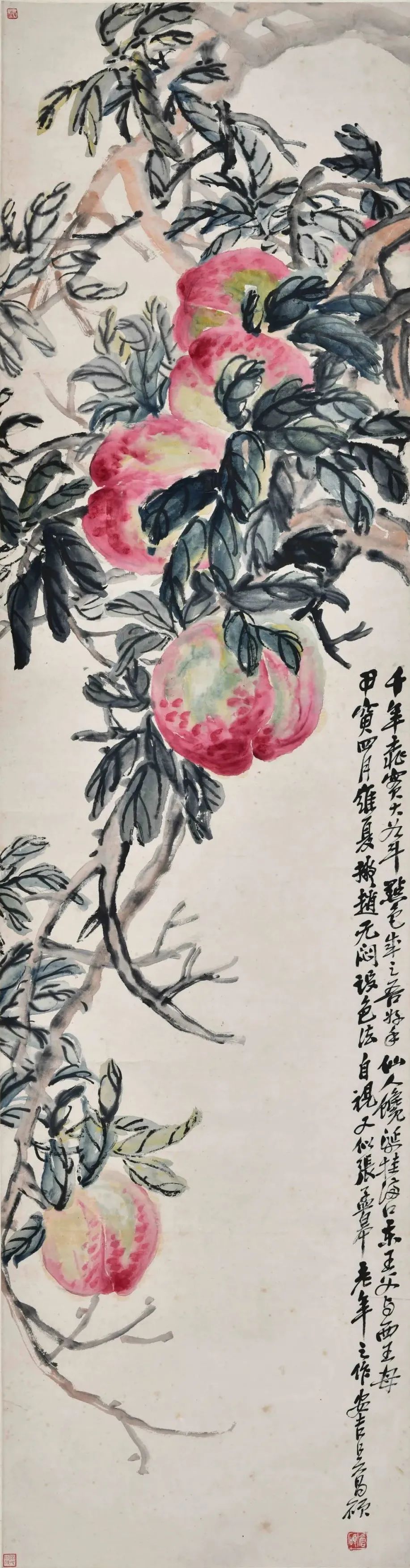 题识:千年桃实大如斗,点色成之吾好手。仙人馋涎挂满口,东王父与西王母。甲寅四月维夏,拟赵无闷设色法,自视又似张孟皋老年之作,安吉吴昌硕。