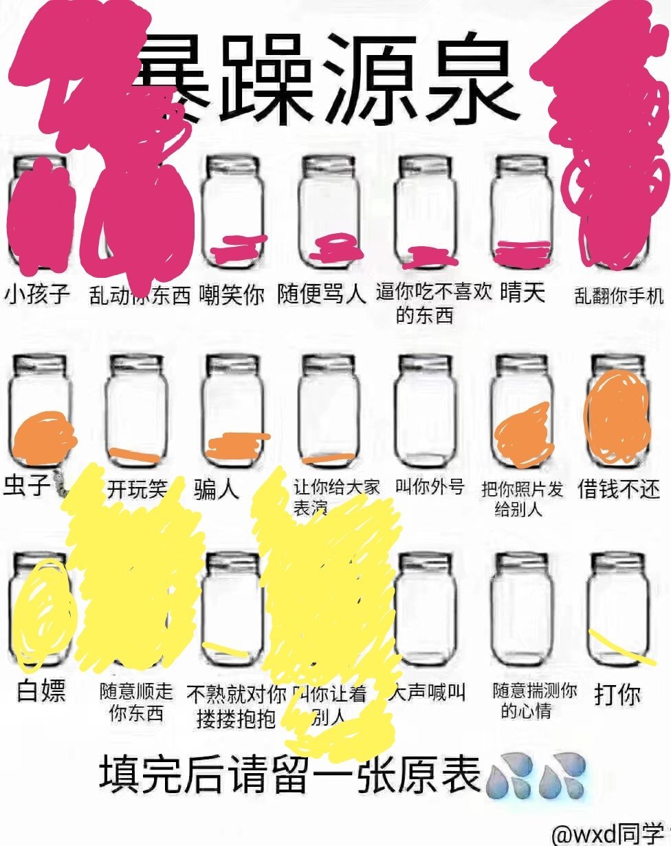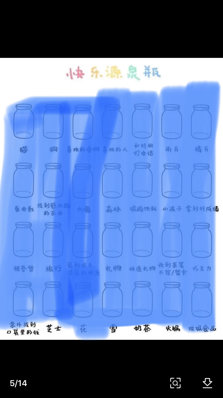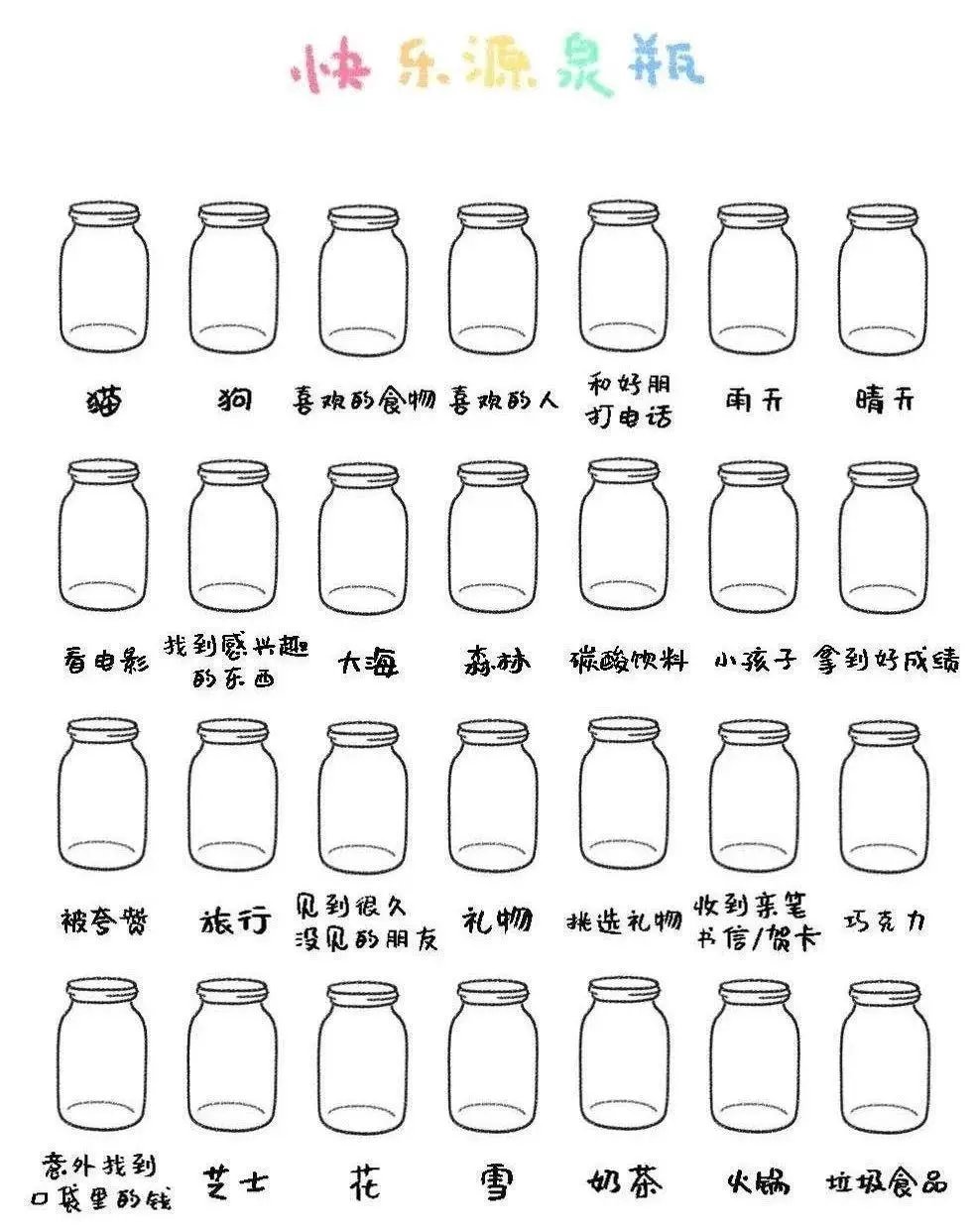 #快乐源泉小瓶子#的玩法规则,是指将每一个瓶子指代不同的事物,你可以通过涂鸦来表达你对事物喜爱程度,涂得越满就代表喜欢的越强烈。