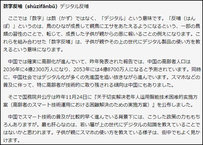 ここでは「数字」は数(かず)ではなく、「デジタル」という意味です。「反哺(はんぽ)」というのは、鳥のひなが成長して親鳥にエサをあたえるようになるという、一部の鳥類の習性のことで、転じて、成長した子供が親からの恩に報いることの例えになります。これらを組み合わせた「数字反哺」は、子供が親やその上の世代にデジタル製品の使い方を教えるという意味になります。
