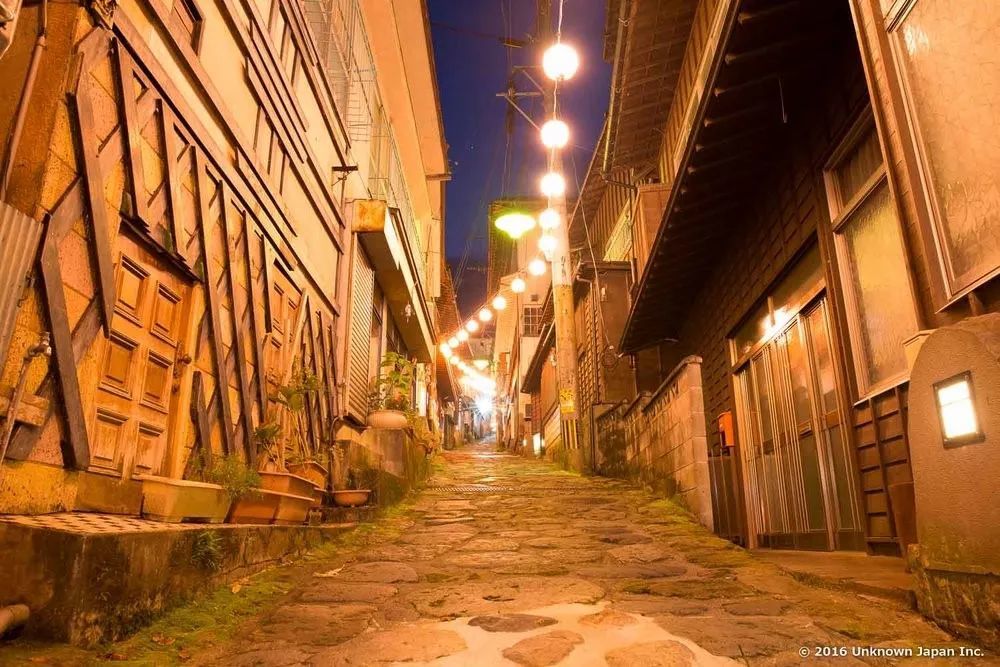 「汤平温泉」历史悠久,传说是从镰仓时代就开设的温泉。在温泉街的街道上,残留着江户时代用自然石铺成的石板坡道,两侧旅馆和商店鳞次栉比。