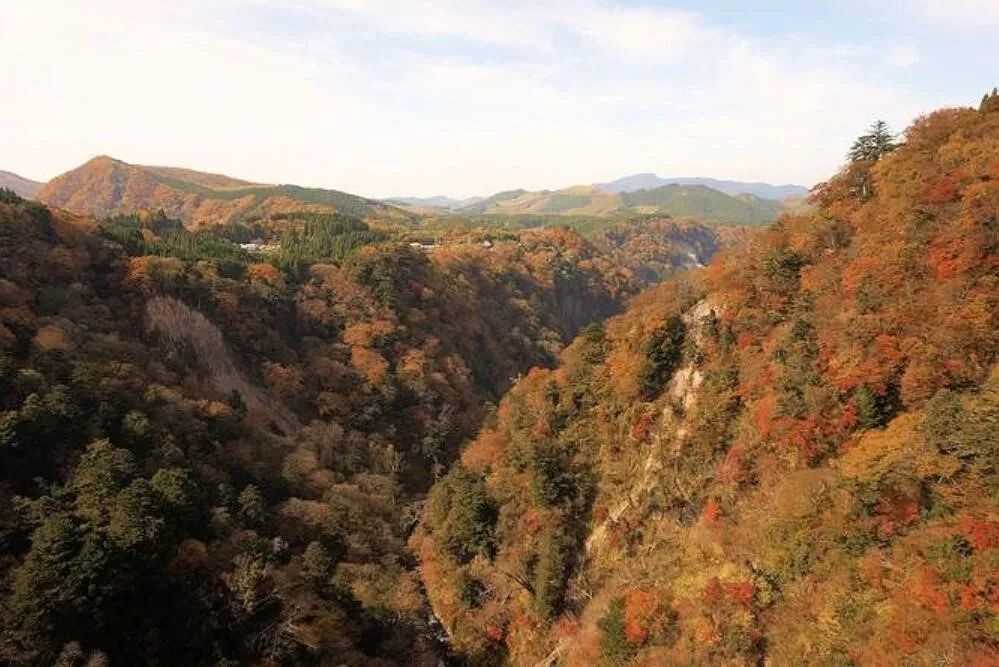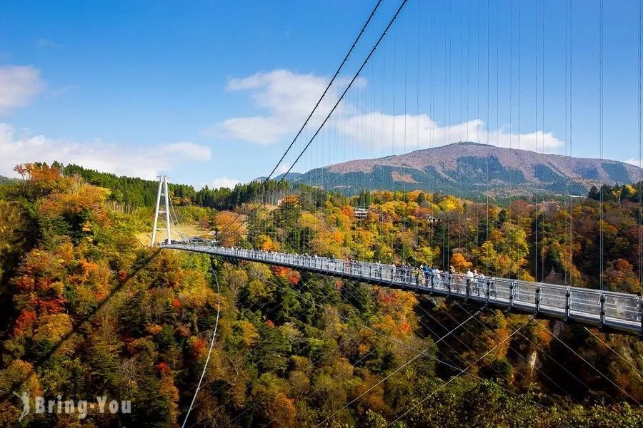 「九重“夢”大吊桥」长390米,高173米,宽1.5米,为步道专用,是日本高度第一的吊桥。沿着溪谷蔓延着原始森林,可以欣赏到四季不同的风景,特别是秋天的红叶季节非常美好。